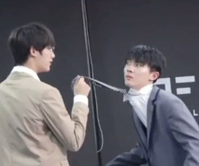 马嘉祺穿着黑色西装,陪着黑色领结,但他似乎并不满意这个领结,因为他曾在一个报刊上看过一张照片,是一个女生拉着男神的领带,他们的目光在空中交汇。