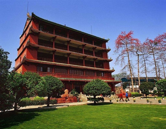 小铭镇海楼被誉为岭南第一胜景。镇海楼因其楼高五层而称其为“五层楼”。此楼于明洪武十三年(1380年),由永嘉侯朱亮祖所建,初名“望海楼”,后又题名为“镇海楼”,有雄镇海疆之意。1956年改为广州博物馆。 关于镇海楼的兴建,有一段有趣的传说。朱元璋称帝、定都南京,建立明朝之后。曾和铁冠道人同游南京钟山,游览中途,铁冠指着东南方对朱元璋说,广东海面笼罩着青苍苍的一股“王气”,似有“天子”要出世了,必须立刻在广州建造一座楼镇压住“龙脉”,否则日后必成大明的祸患。朱元璋听后,急忙派人到广东调查,发现广州的越秀山上现王者之气。随后朱元璋下诏,命令镇守广州的永嘉侯朱亮祖在山上建一座楼将王气镇住。于是,朱亮祖在越秀山上兴建了这座“楼成塔状,塔似楼形”的镇海楼。 镇海楼是广州现存最完好、最具气势和最富民族特色的古建筑,楼高28米,阔31米,共五层。第一、二层用红砂岩条石砌成,三层以上为砖墙,外墙逐层收减,似楼似塔,红墙绿瓦,造型古朴独特。楼前对峙一对二米高的红砂岩石狮,为明代雕刻。清初诗人屈大均曾有诗赞镇海楼“可以壮三成之观瞻,而奠五岭之堂奥”。在清朝时期,镇海楼一直是广州最高的建筑物。登上楼顶,可以看到珠江和白云山。