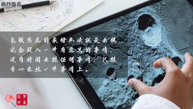 克服焦虑的最好办法就是去做完全投入一件有意义的事情,没有时间去想任何事情,只想专心在这一件事情上。