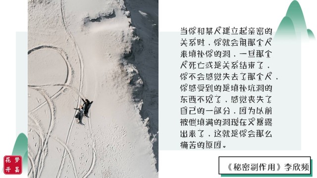 当你和某人建立起亲密的关系时,你就会用那个人来填补你的洞,一旦那个人死亡或是关系结束了,你不会感觉失去了那个人,你感受到的是填补坑洞的东西不见了,感觉丧失了自己的一部分,因为以前被他填满的洞现在又暴露出来了,这就是你会那么痛苦的原因。