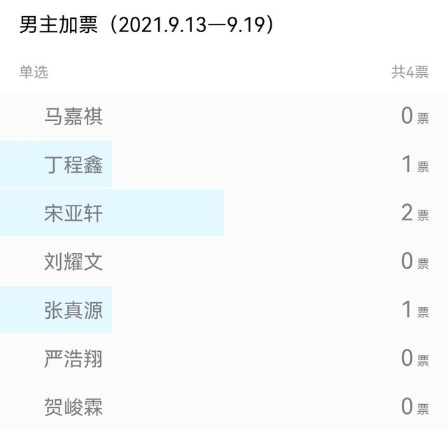 截止2021.9.20投票情况:【马嘉祺】7票;【丁程鑫】37票;【宋亚轩】12票;【刘耀文】10票;【张真源】3票;【严浩翔】4票;【贺峻霖】7票.