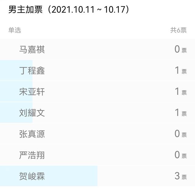 截止2021.10.18投票情况:【马嘉祺】23票;【丁程鑫】58票;【宋亚轩】30票;【刘耀文】28票;【张真源】3票;【严浩翔】13票;【贺峻霖】28票.