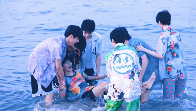 丁程鑫捂住自己的屁股,好家伙,自己的裤子后面全湿了,他眼见不妙,让其他人一起把马嘉祺丢水里去