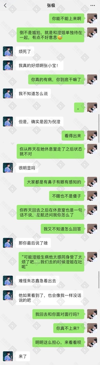 张真源你们里面不是人很多吗?然后当时是倪澄刚好在吐,张极就说可以让他进去吗,他真的很担心