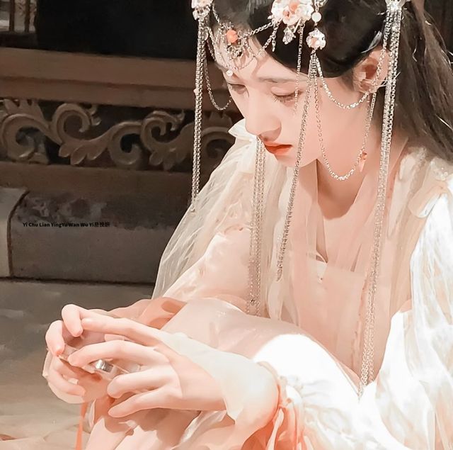 少女乌眸红唇,颈上带着一条玉石项链,衬得皮肤白如雪,低垂鬓发斜插镶嵌珍珠碧玉簪,花容月貌出水芙蓉