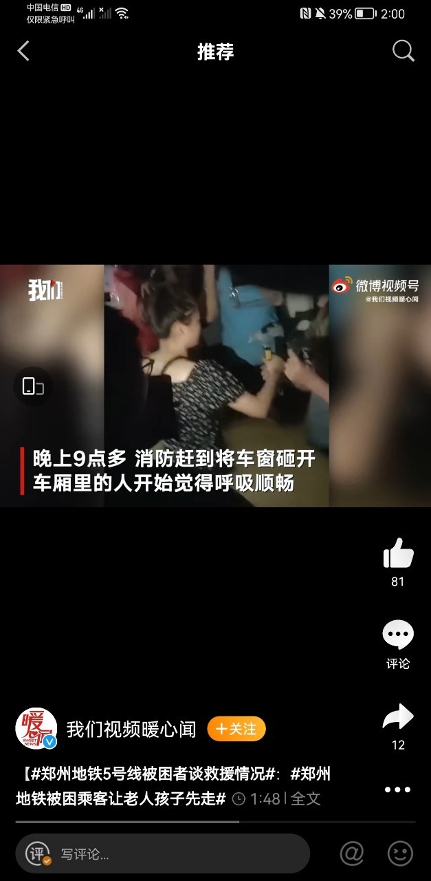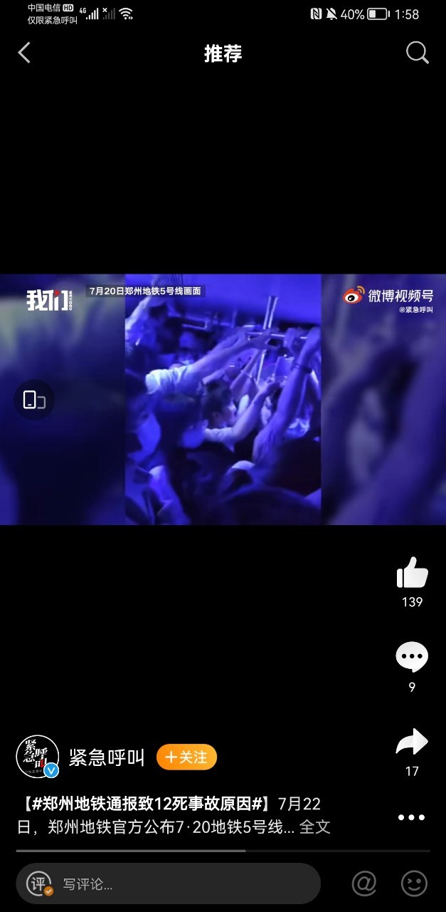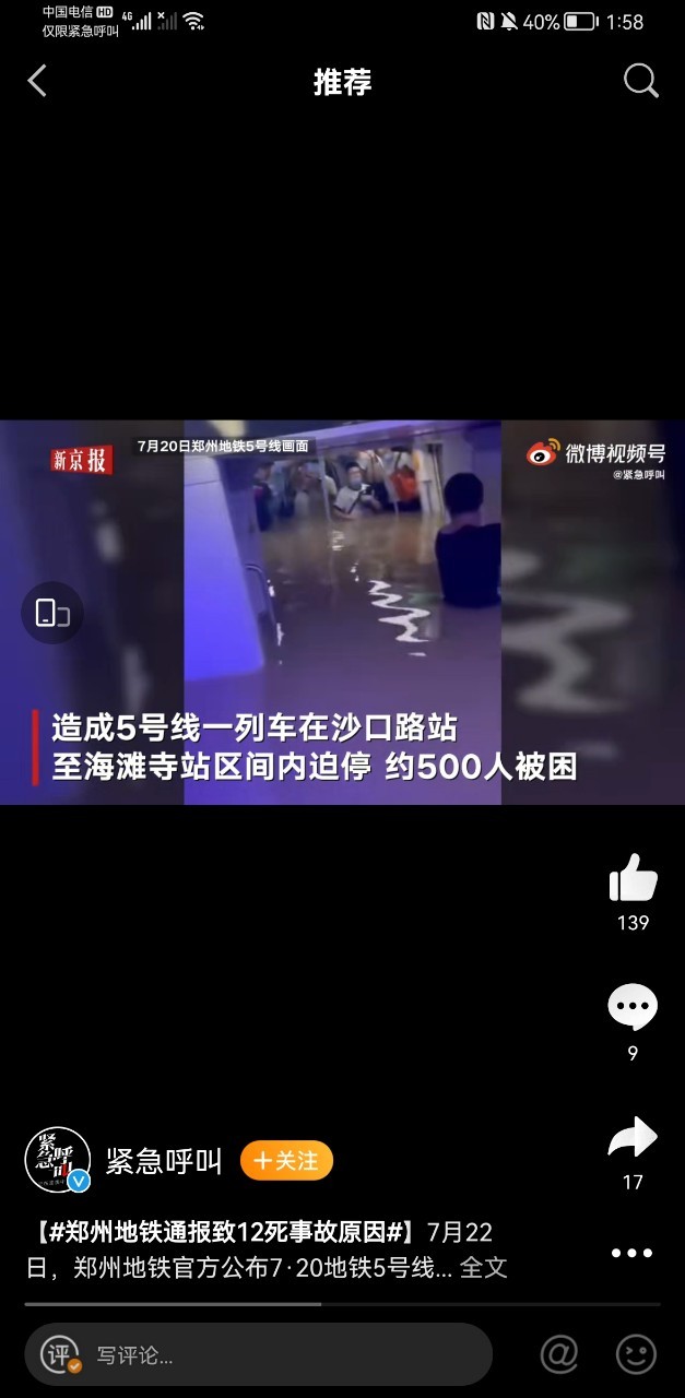南宫和看见“地铁中全是积水,车门无法打开,视频里,人们无助的呐喊。 颤颤巍巍的写遗书,拍视频来记录自己最后的愿望。或者打电话给最想见的人,说出自己一直没勇气说出的话。中间车门开了然后,更多的水涌了进来。淹没至了脖颈,关上车门后。缺氧,难以呼吸绝望感袭来,许多人都泪眼婆娑的跟父母打着视频电话。信号的中断,电话的终止,面对这样的绝境他们只能等待,等待,再等待。”