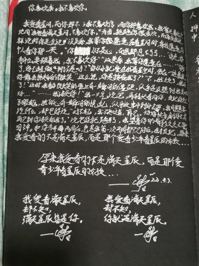 今日二更,我说三更的,但是现在看这个点已经不太可能了,那就先二更吧,二更其实今天已经没有什么特别的需要说的了,我感觉我的黑历史曝光,现在整个人都是羞愧的,除了上一篇说到过的黑历史,我曾经在和黑历史同样的时间写了一个黑本,那段时间是小学一直特别流行,什么放狠话啦,写那种句子之类的,然后我就买了一个黑本,用那种高光笔,什么颜色都有的写了,现在已经写了很多页了,我准备把其中的一篇小小的小小的,我自己写的一篇小小的短文,发过来,话不多说,先放一张照片,然后即将开始更文,不喜勿喷
