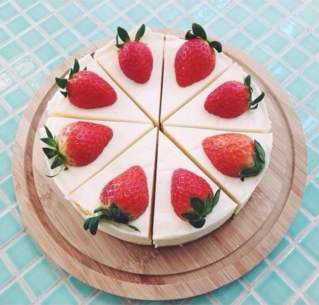 奶油涂抹好后,再将切好的草莓放在蛋糕上。