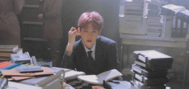 只见边伯贤穿着一身西装,拿着一支笔顶着头,桌子上的书被乱七八糟的摆放着。