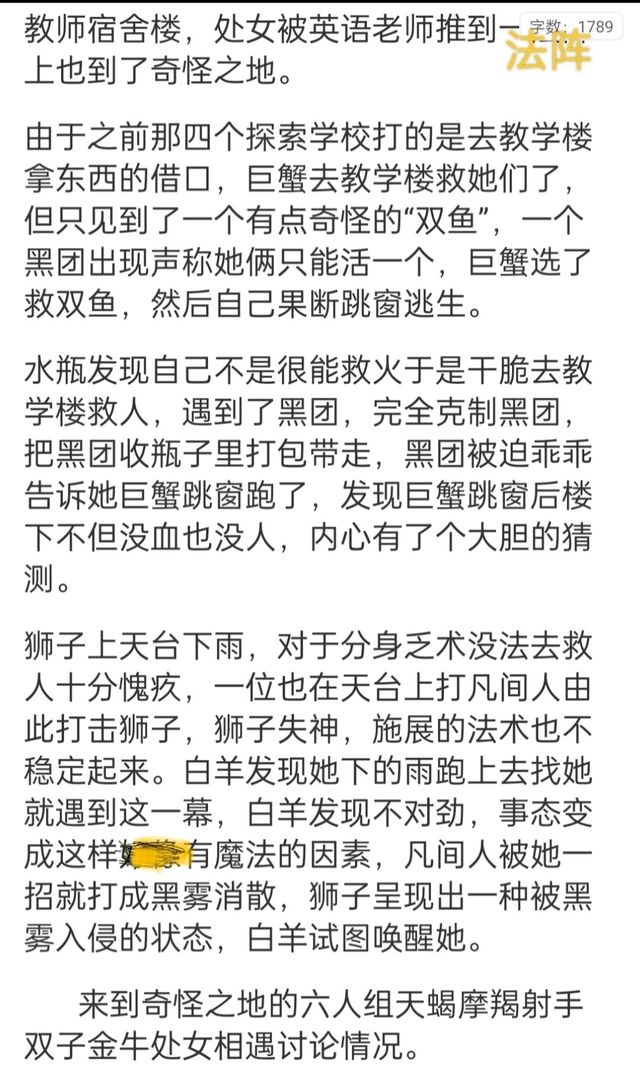 她知道那个亲爱的Cancer是为了找她们才到教学楼去的,也不敢去想在被火焰吞噬的教学楼里一个凡间人能有多大的生还概率,她不知道双子双鱼射手到底遇到了什么事,她还不能立刻去救Cancer,操场上没有老师,她得去看看教师宿舍楼怎样了——