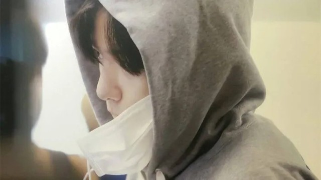 穿着简单干净的连体帽衫,没带什么行李孑然一人,摘开纯白口罩