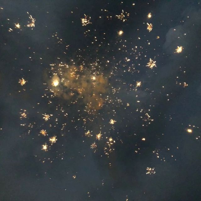 刚燃放到空中的烟花金光四溅,由一小片区域汇成盛大的烟花绽放在浓郁的夜色