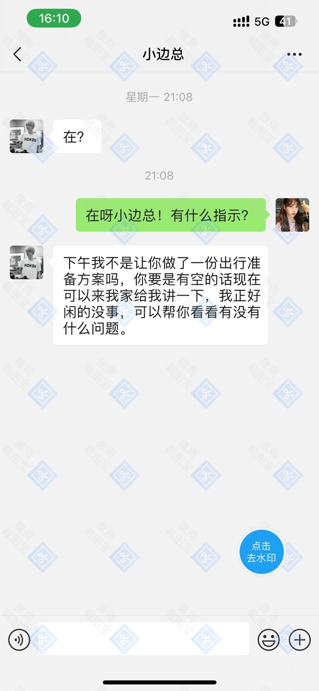 小边总:下午我不是让你做了一份出行准备方案吗,你要是有空的话现在可以来我家给我讲一下,我正好闲的没事,可以帮你看看有没有什么问题。