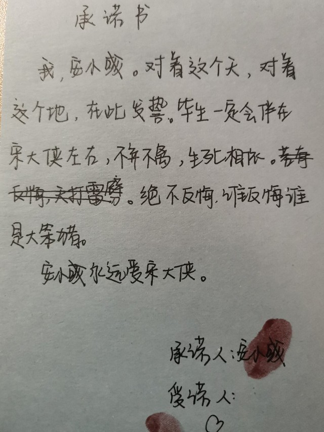 作者大大承诺书奉上!(emmmm我的字不是很好看,将就一下啦,爱你们,纸的颜色选的蓝色,你们懂的)