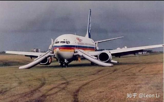 我在后面遥遥地望过去,看到照片上是一架波音737-300,涂装是中美洲航空的。她停在草坪上,放下了充气滑梯