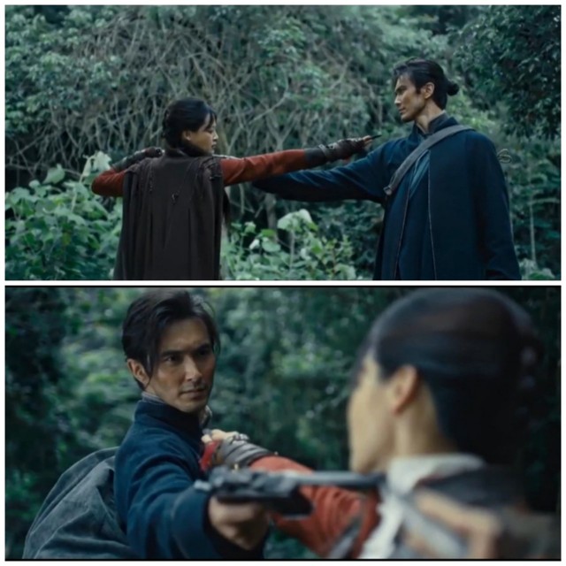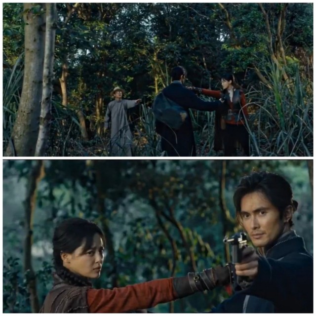 两人越跑越远,红姑娘趁机,甩出了飞刀,飞刀被直接打在了树上,红姑娘一边追一边甩出飞刀想杀死鹧鸪哨,鹧鸪哨也身手不凡直接一枪就把飞镖打落,红姑娘趁此机会直接上前,用飞镖架在了鹧鸪哨的脖子上,鹧鸪哨的枪也对准了红姑娘的脖子。