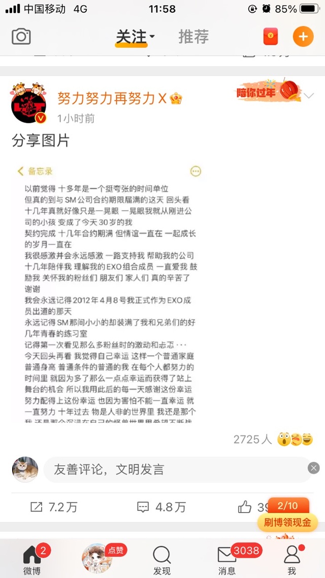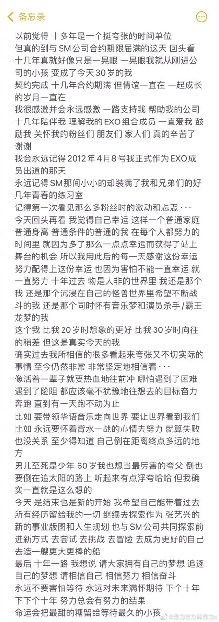 作者转眼EXO出道十周年了,艺兴与SM的合约也到期了。最后合体都没见到呢,就解散了。见证了粉丝名从行星饭到爱丽的蜕变,还有EXO最变动的时期,从刚开始的十二帝国,到如今的九鼎盛世,我从不后悔认识他们,喜欢他们,他们也像我的光一样,不断的把我救赎,我相信我们是互相奔赴的喜欢,也希望我们还有下一个十年! 艺兴的新歌《酒》表达了他对成员们的爱