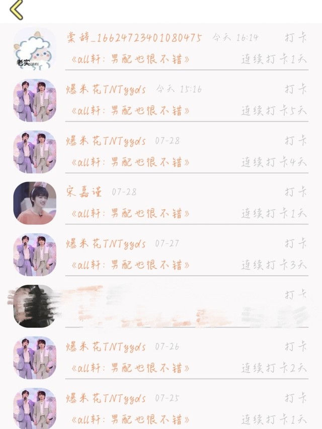 JUS-DREAM“然后就是这个“爆米花TNTyyds”你打卡我挺多次的,我也做不了什么,就打打卡,收藏一下,送个鲜花表示谢意”