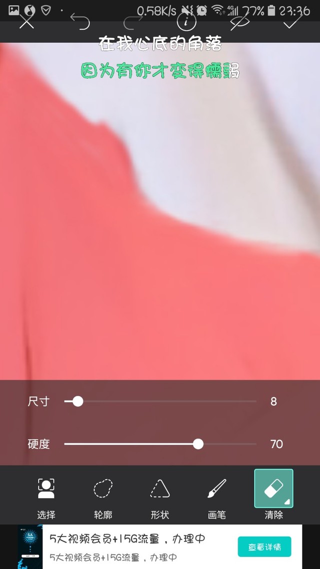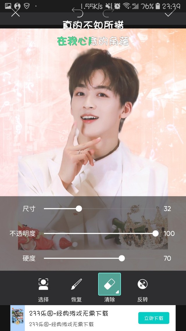 宋小浣点击最上面一排的左边图标橡皮擦,擦去边缘的一些部分,让人物与溶图更相融一点。