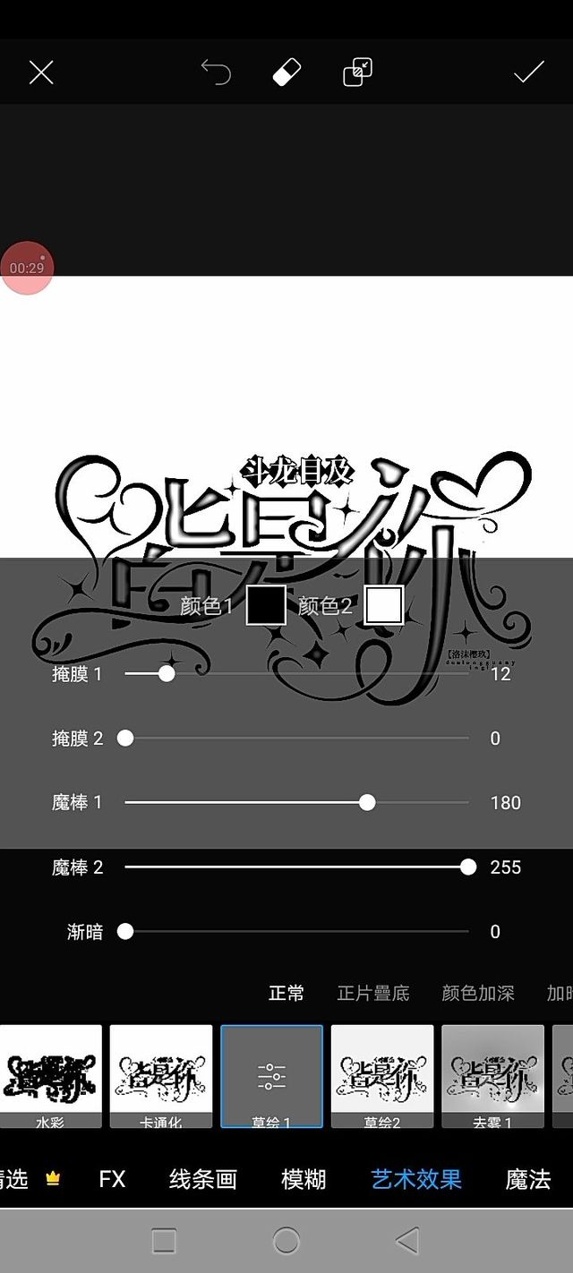 辣条味的薄荷糖.“不用添加字设,直接点击【fx特效】就可√,然后找到【艺术效果】——【草绘1】——【正常】——数值如图.”