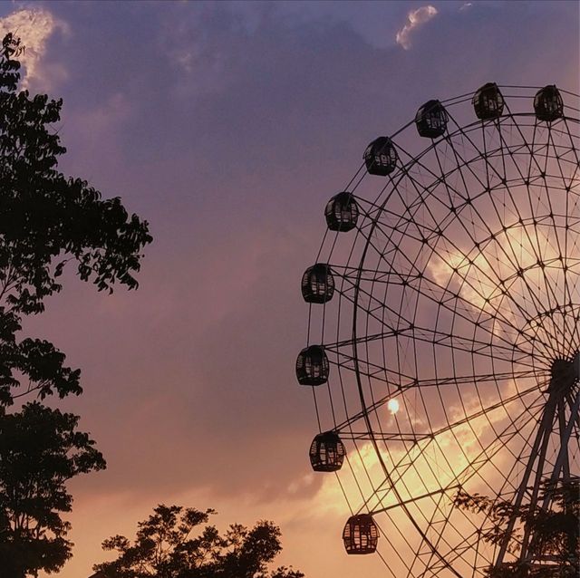 日落西沉,摩天轮立于这梦幻的彩色绸缎中,似与世事无争,细水长流般缓缓的在夕阳落幕下转动。