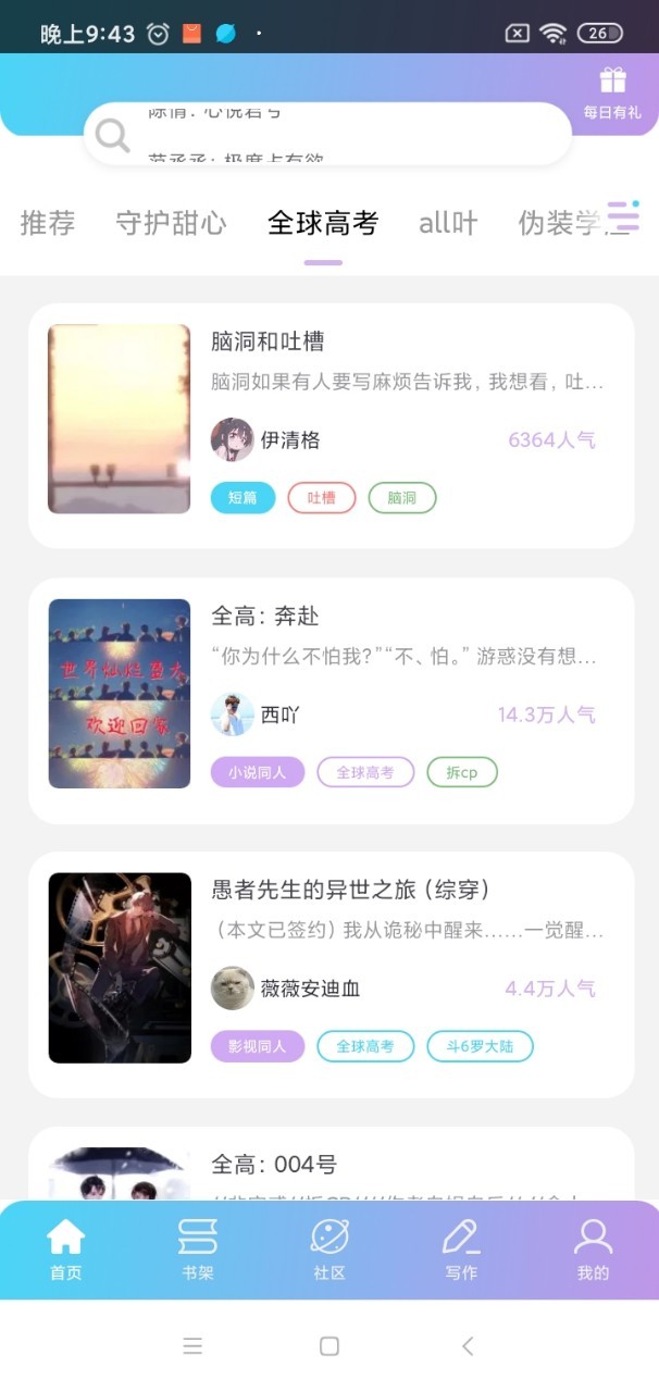 对于我来说,我这个作品出现在守护甜心,那还算合理,毕竟我前面写了跟守护甜心有关的内容,这个全球高考中若看见,就有些怪了吧?我之前写过跟全球高考有关的脑洞吗,没有吧。所以这是一个什么奇葩现象