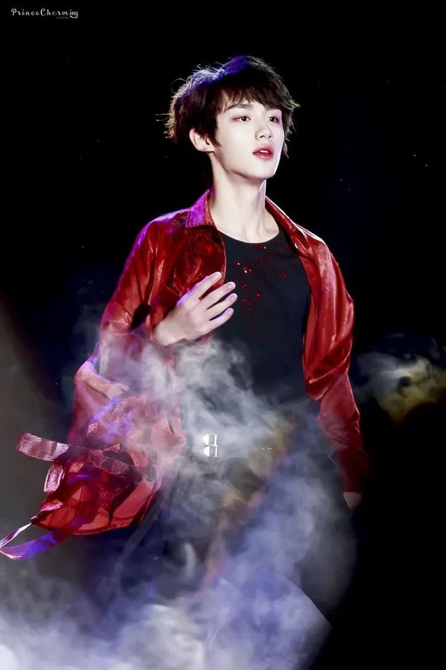 少年一袭红衣,黑色内搭,是刚刚在台上的那身舞台装,妆也还没来得及卸,明明是少年,却有一种女生的艳丽,但也不失他这个年纪的英气。