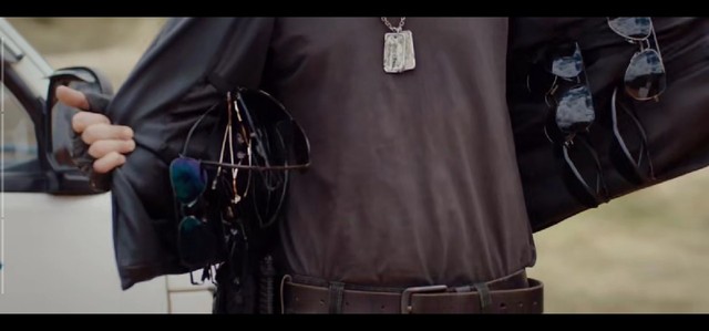 黑瞎子我这有(掀开衣服两边都挂满了墨镜,各种各样的都有)