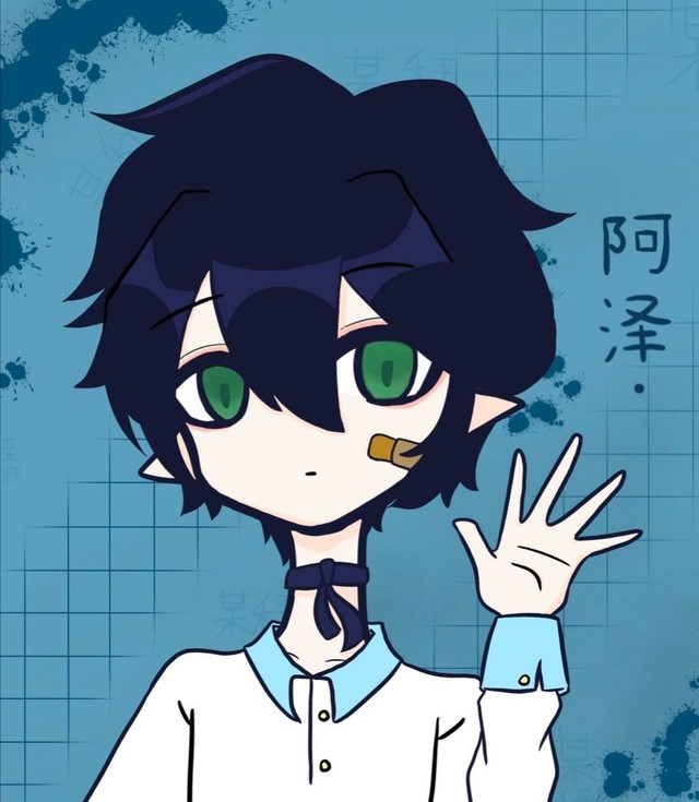 深蓝发色,灰绿色的瞳孔,眼角处有两颗泪痣,脸上常常贴着一个创可贴。脖子上系着一根黑色丝带。衣服就是白衬衫加黑色休闲裤,白色运动鞋。