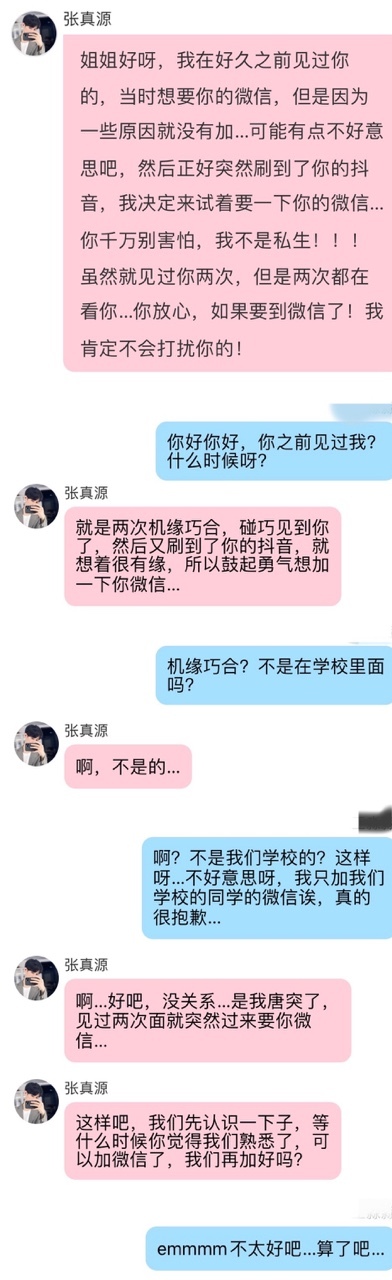 张真源就是两次机缘巧合,碰巧见到你了,然后又刷到了你的抖音,就想着很有缘,所以鼓起勇气想加一下你微信…