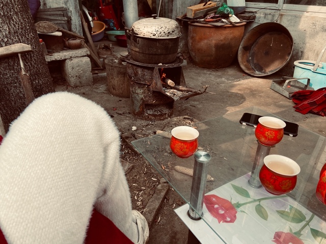 马姐家是在院子里面做饭,我们把小桌子搬了出来泡着茶,磕着瓜子听着戏曲儿,唠着嗑做饭。