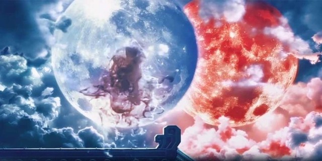 有两个月亮颜色还都不一样分成了红蓝两种,蓝色的那个似乎有什么在上面