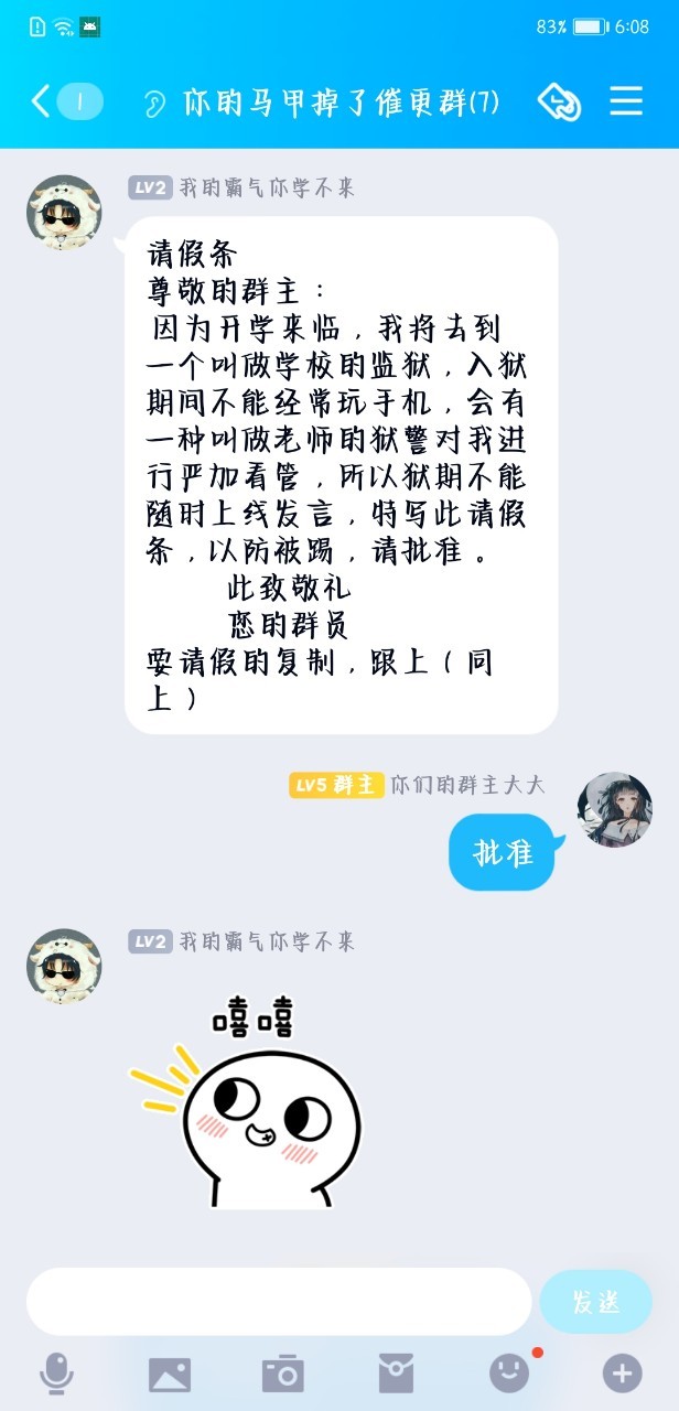 对了群里有个小可爱给我发请假条了