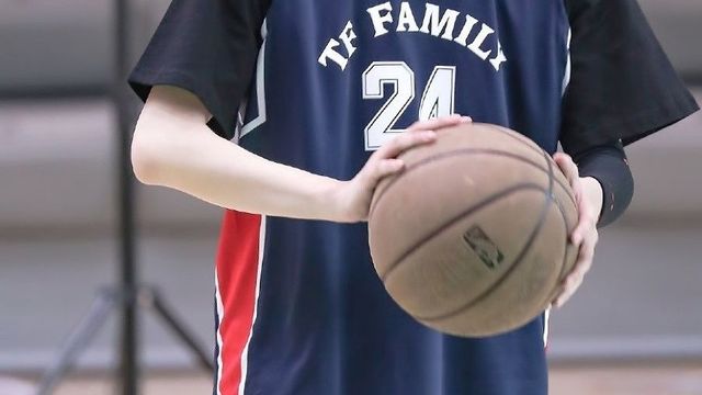 他站在你的后方,手放在你的手掌上,你手里拿着篮球,他凑在你的耳边说如何运球和投篮。