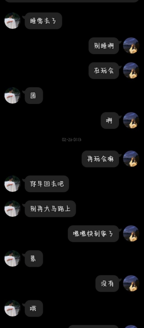 当时他要睡觉然后我无聊然后就不让他睡(当时在马路中间拍了张照片给他发过去)凌晨一点多没大有车,他当时挺生气的聊天记录就不发了