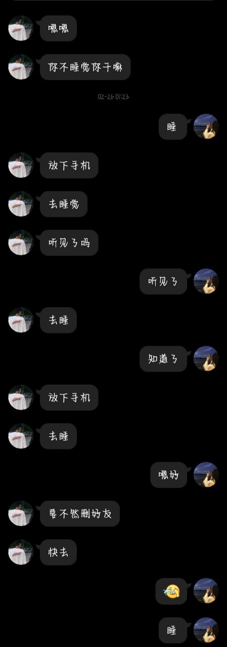 当时刚到家喊我睡觉但是我睡不着(拿删好友威胁我)