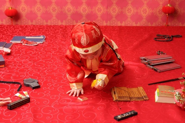 常宁周岁,小福晋们也都打扮得各具风格,布木布泰作为祖母坐在中间的椅子上,礼官说;“吉时到,给五阿哥梳洗抓周”