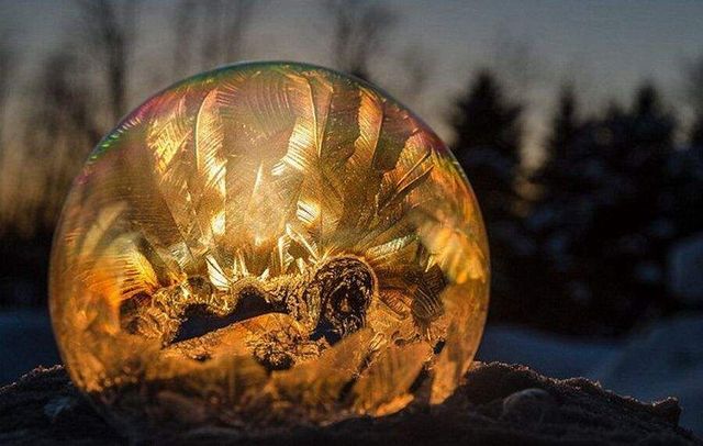 泡泡的表面在零下的温度渐渐结冰,雪花般精致的冰晶构成了一副美丽的画