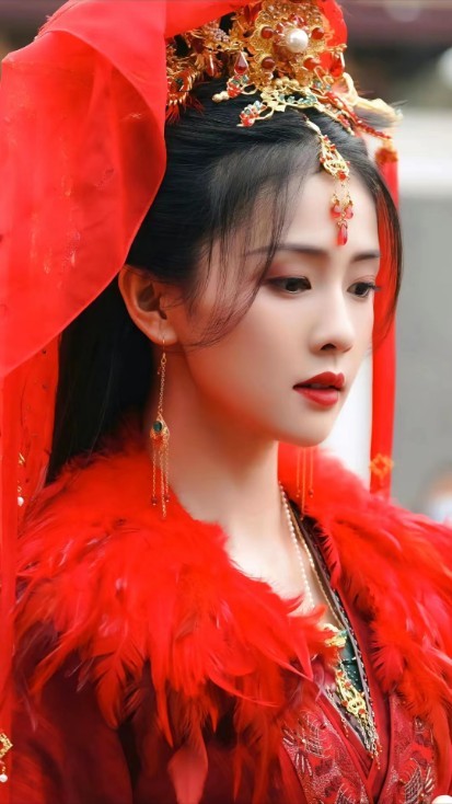 一身红色婚服,用金线绣着整只的凤凰,金丝丝嵌红宝石流苏再额间微微摆动着