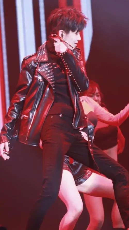 穿着一身简单的黑色搭配,外套上似有铆钉、在灯光下闪闪发光。