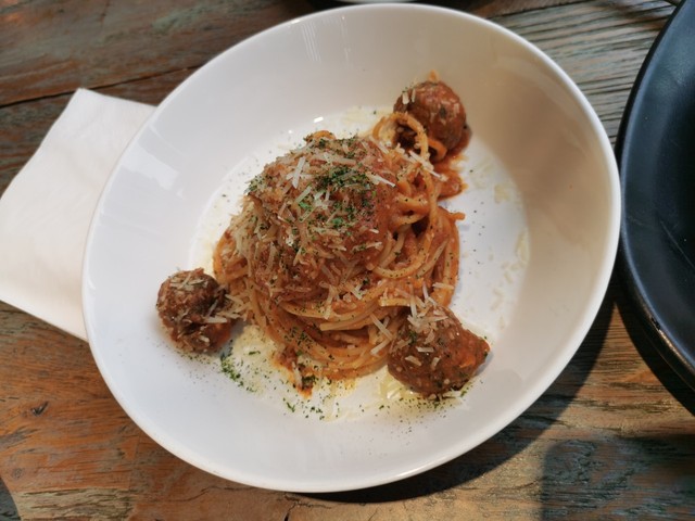 没几分钟,酱汁浓郁的番茄肉丸意面和香喷喷的黑胡椒牛排便出锅了。