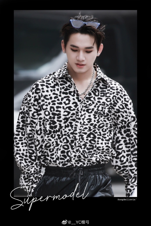 今天的刘昌文格外帅气,上衣搭配时尚豹纹衬衫,扣子扣在第四个扣的位置,露出精致的锁骨和坚实的胸膛,个性的银制饰品佩戴在脖颈上,休闲风的黑色皮裤宽松随意,痞气十足,荷尔蒙爆炸。
