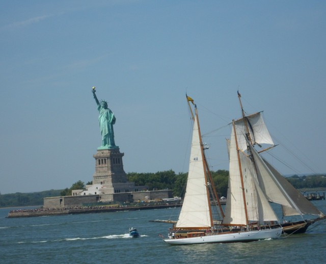 “宝贝,今天天真好,万里无云,正真的自由女神像那么大,果然壮观,你看自由女神像那边还有个仿古的大帆船,挺好看,哈哈!”