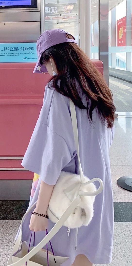 洛笑怡下了飞机,戴着紫色鸭舌帽,帽子压的很低,还用口罩和眼镜装扮自己(洛笑怡在美国也有很多粉丝呦~)