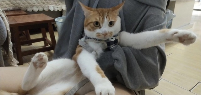 曦看见了,挺可爱的小橘猫,我进来的时候还冲我喵喵叫,我看它可怜,把包里剩下的最后一根火腿肠给它了
