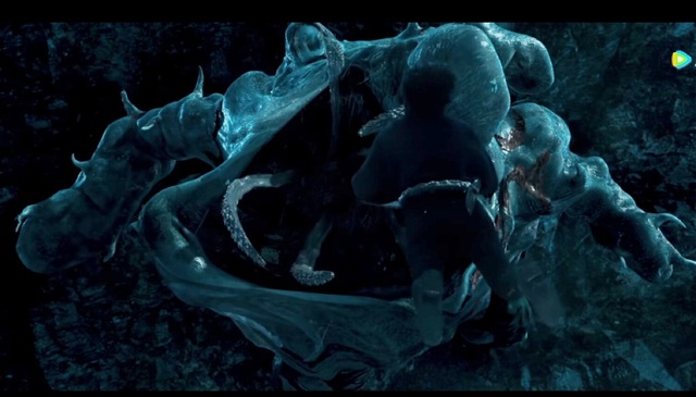 这怪兽被子弹打的嘶吼颤抖、嘴里的触须却不肯放过到嘴边的美味!透明柔软的身体开始在崖壁上攀爬、想要带着猎物一起离开!