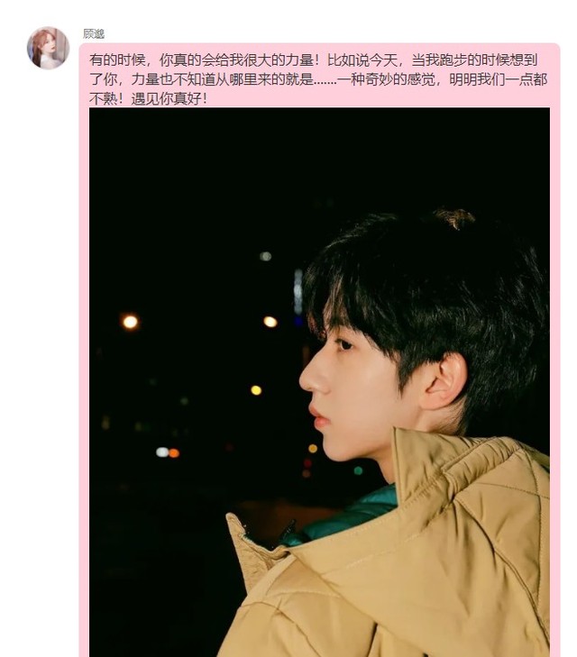 顾邈有的时候,你真的会给我很大的力量!比如说今天,当我跑步的时候想到了你,力量也不知道从哪里来的就是.......一种奇妙的感觉,明明我们一点都不熟!遇见你真好!