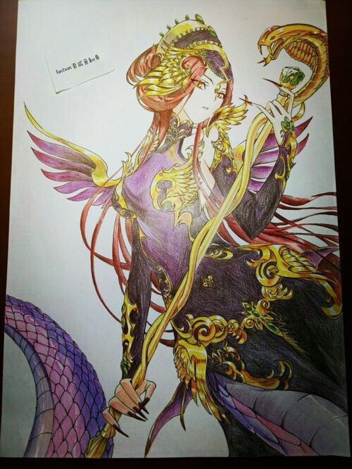 说着她便给自己进行了武魂附体 只见原本黑色的长发再一次的变长,并且在一阵紫光之中变成了红色同时被不知何时出现的发饰挽成了姬发,身体稍稍的变得修长,一双墨瞳在一睁一闭之间变成了一对黄色的蛇瞳,双手十指上的指甲变长并泛有代表毒素的红色,而她修长的双腿也在一阵紫光之中化为了带有紫色鳞片的蛇尾,在这些变化之中她的手中也不知何时出现了一根蛇头杖,最让人惊讶的是那徘徊在蛇杖上的黄色光环。