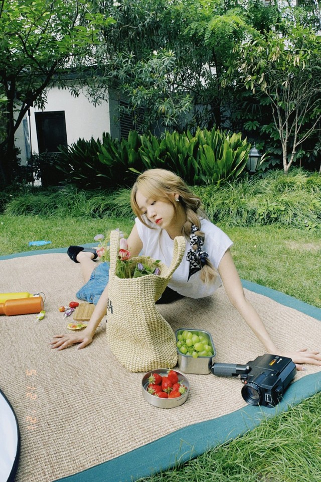 女孩安详的坐在野餐布上