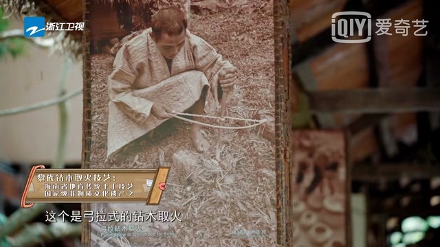 万能人物小梁:这条文化长廊呢,都是以这个图片为主,这个是攻拉式的钻木取火,一些重要节日的话,我们的大祭司就会点燃这个火,另外就是这位阿公的衣服,使用树皮布做的,现在海南到黎族里会做的也就剩五个了,这是用”见血封喉“的树皮做的。